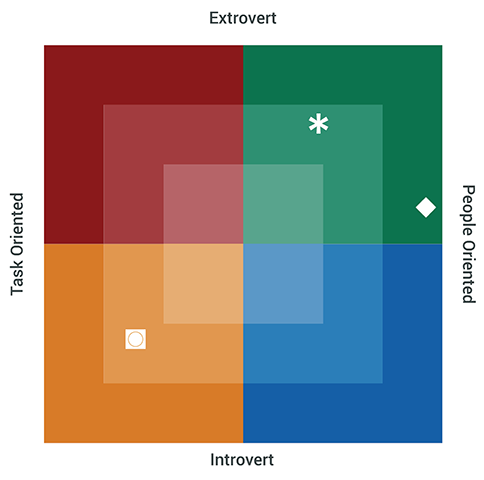 In your meeting space, set up a life-sized version of the Birkman Map, using the Birkman Floor Map, Birkman Tape Set, or Birkman Cones. Have team members stand in the location of each of their symbols as you talk about Interests, Usual Behavior, and Needs on an individual level. This helps people visualize how they relate to their peers on the Birkman Map. As you transition from Interests to Usual Behavior to Needs, have everyone note how the orientations change. For each symbol rotation, ask the discussion questions listed below:
